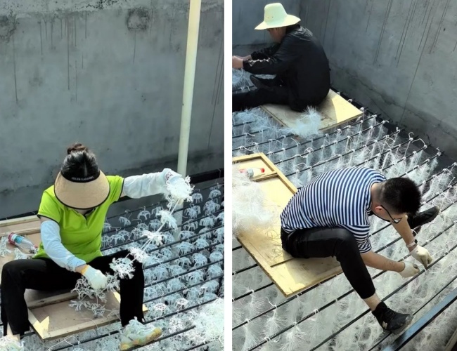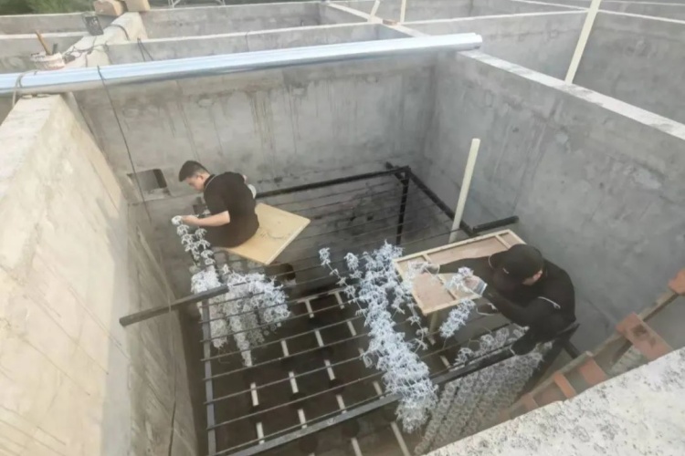 在鋼架焊接工作收尾后,緊接著的填料綁扎成了搶工期的關(guān)鍵。這些密密麻麻的填料是污水處理的“主力軍”,需要手工逐一固定在鋼架上,工作量大且要求細(xì)致。公司當(dāng)即決定:全公司總動(dòng)員,所有人前往施工現(xiàn)場(chǎng),進(jìn)入池內(nèi)協(xié)助綁填料。